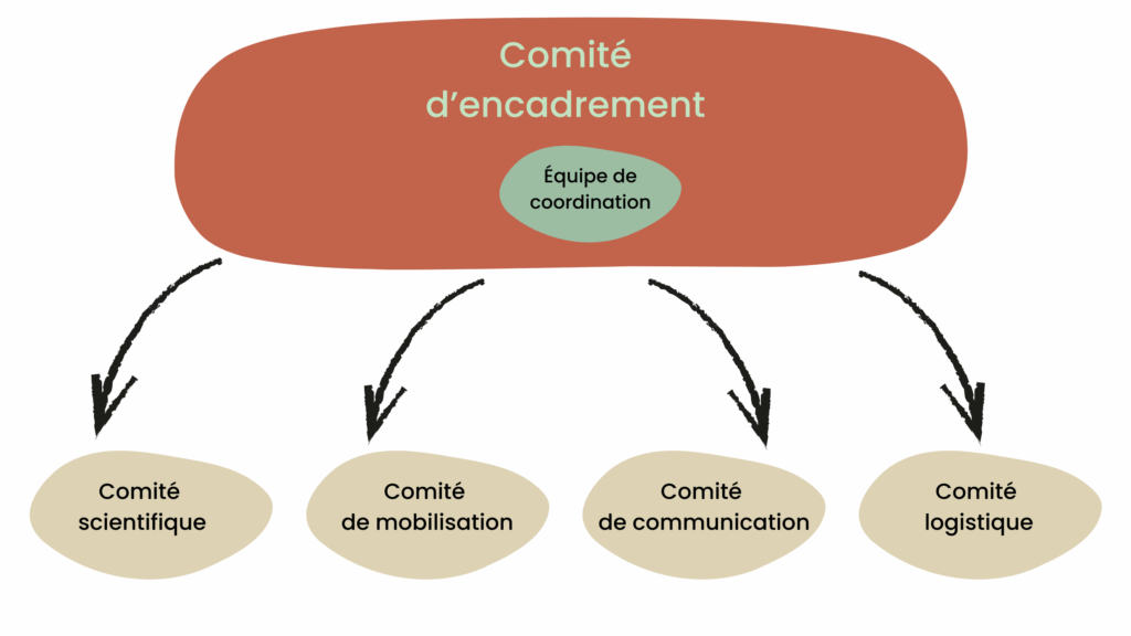 Le comité d’encadrement propose les grandes lignes du projet en dialogue avec l’ensemble des comités organisateurs et valide les étapes clés du projet. Il établit et garantit également le fonctionnement démocratique du projet, notamment au sein des comités organisateurs, et s’assure que toutes les organisations partenaires aient équitablement voix au chapitre.